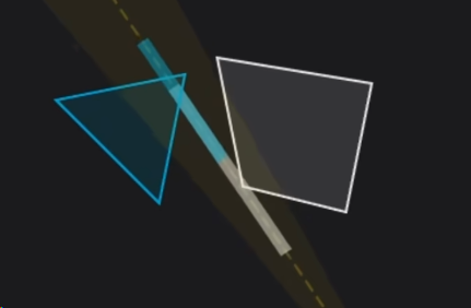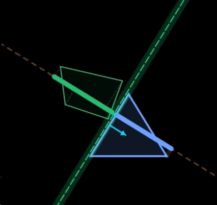 例子:一个四边形和三角形做碰撞检测,共有7条边,因此有7个法线向量作为投影轴,若其中任意一次两个图形的投影是分离的,则证明没有发生碰撞。